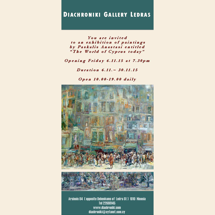 You are invited to an exhibition of paintings by Pasklais Anastasi entitled “The World of Cyprus today” Opening Friday 6.11.2015 – 30.11.2015 Duration 6.11.2015 – 30.11.2015 Open 10.00 – 19.00 daily Address: Arsinois 84 (Opposite H&M Ledras), Nicosia 1011Telephone: +357 22680145Email: diachroniki@cytanet.com.cyWebsite: www.diachroniki.com