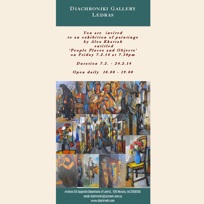 You are invited to an exhibition of paintings by Alex Khattab entitled ” People places and objects” Opening on Friday 7/2/2014 at 7.30 pm Duration 7/2/2014 – 24/2/2014 Open 10.00 am – 19.00 pm Address: Arsinois 84 (Opposite H&M Ledras), Nicosia 1011Telephone: +357 22680145Email: diachroniki@cytanet.com.cyWebsite: www.diachroniki.com
